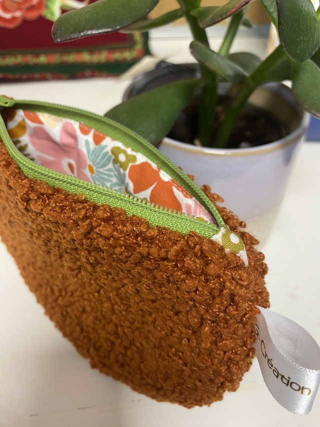 Chaleur du tissu bouclette couleur caramel, éclat du coton fleuri rétro et grain de folie avec la sangle arc-en-ciel 🌈 — le Duo Pétale & Bouclette incarne la bonne humeur cousue main.