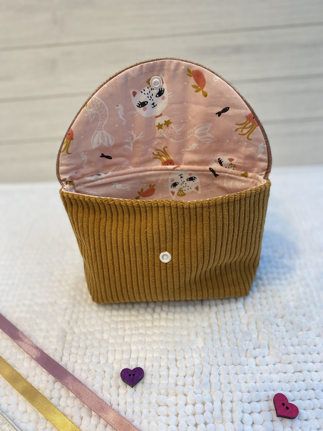 Réalisée en velours côtelé pour une tenue souple et résistante, elle est doublée en coton imprimé pour une jolie surprise à l’ouverture.