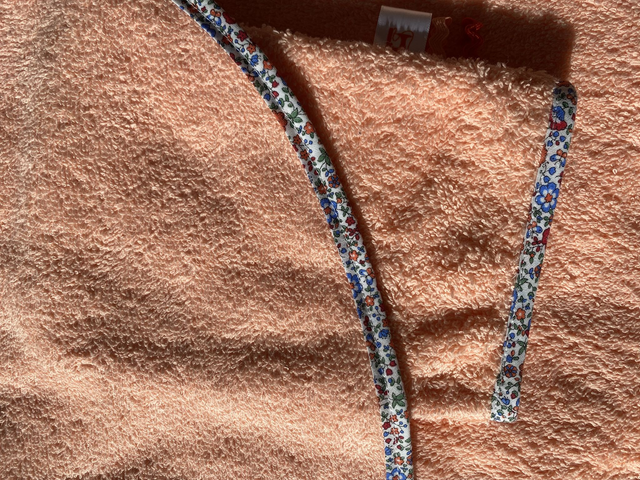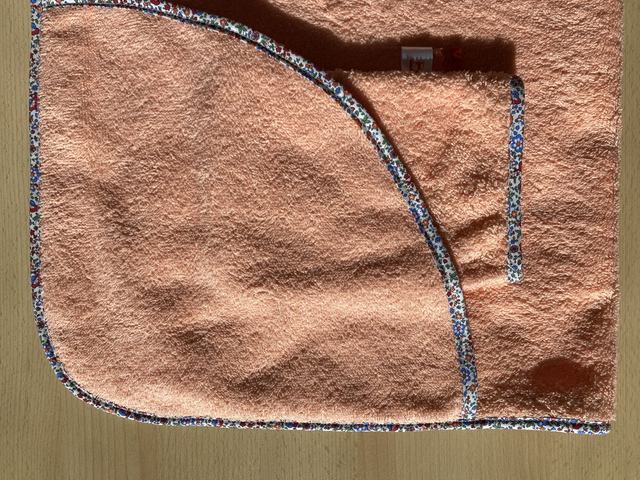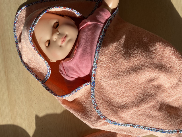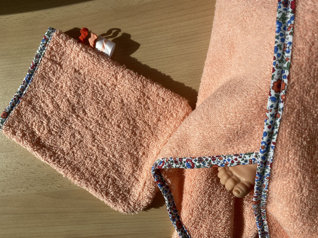 Cape de bain et gant coordonné, Marin – Marine est un ensemble pratique et fait main, pensé pour envelopper bébé de douceur à la sortie de l’eau.